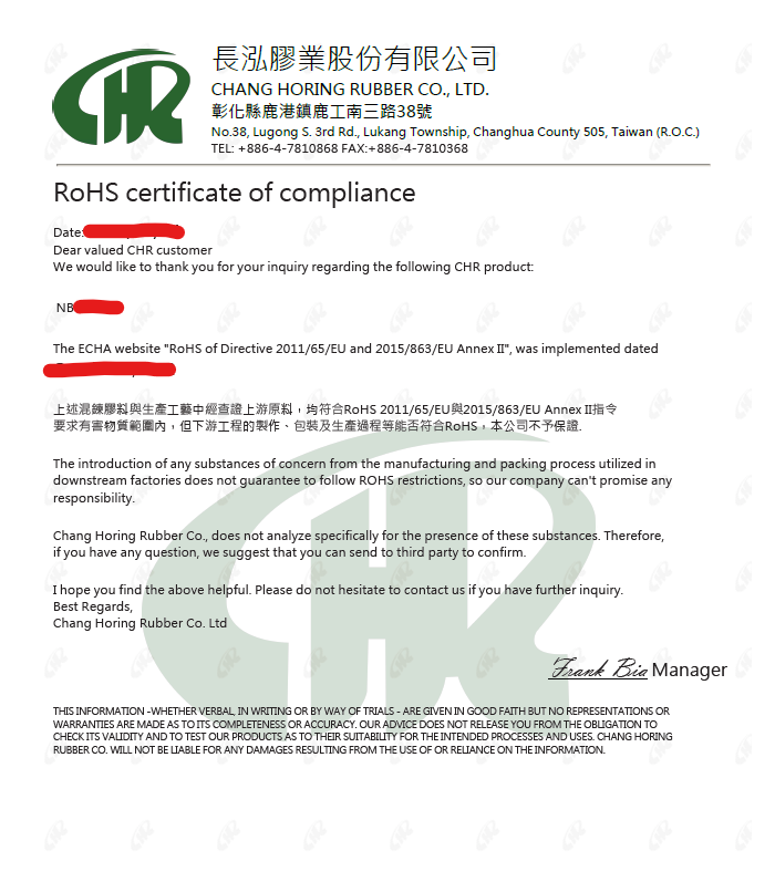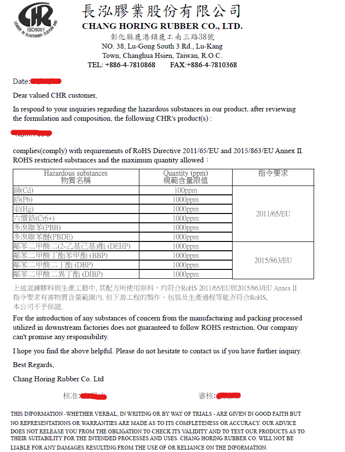 昌裕橡膠-採用的供應商皆為國內大廠及國內外大品牌原料,原料方面皆可配合採購使用 符合 REACH、RoHS、FDA、PAHs...等規範原料。